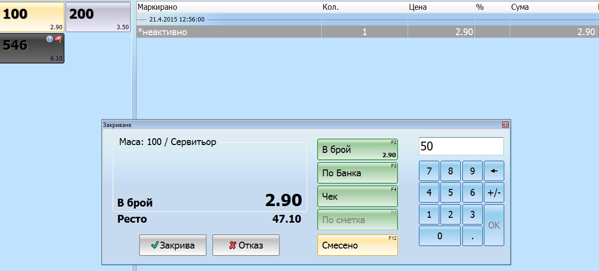 Значи... Когато сервитьор си закрие персоналния отчет, няма проблем. Но... ако потребител с права за закриване на персонален отчет и отчет на заведението закрие сервитьора, % липсва в Справка Персонални Отчети.