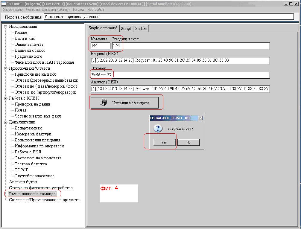 2. Проверяваме версията на терминала. Това става от FDinit NAP Configurator. (фиг.3). с команда 144 и параметър 1,63 – връща версия на фирмуер. И команда 144 и параметър 1,54 връща последни две числа на фирмуера. (фиг.4) Ако версията е по стара от юли 2011 задължително се записваме фирмуер (CorrIntTer.hex) и след това (IntTer_BUL_220312_v1.40.28.hex). Първия е корекционен файл, а втория е до версия 1.40.28